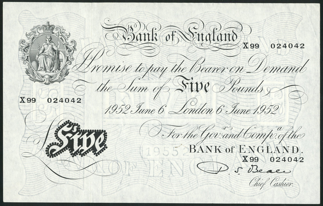 Bank of England, P. S. Beale, £5, London, 6 June 1952, serial number X99 024042, black and white, ornate crowned vignette of Britannia at top left, value in black tablet at low left