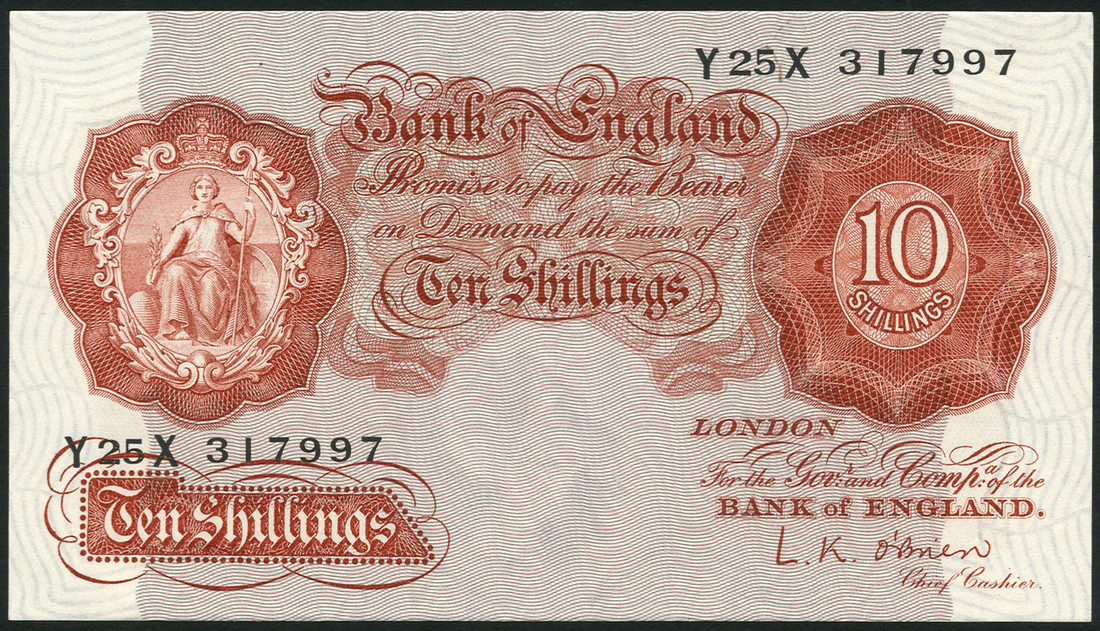 Bank of England, L.K. O'Brien, 10/- (2), ND (1955), serial numbers Y25X 317996-7, red, Britannia at left, value at top right and in tablet at low left