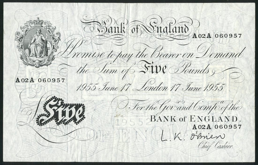 Bank of England, L.K. O'Brien, £5, 17 June 1955, serial number A02A 060957, black and white, ornate crowned vignette of Britannia top left, value in black tablet low left