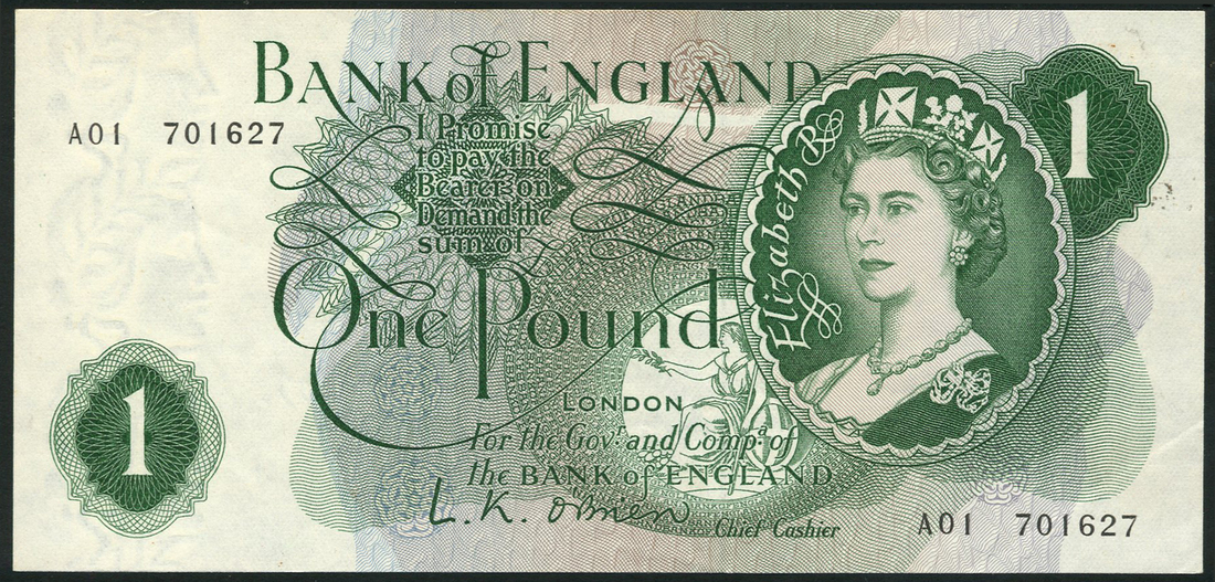 Bank of England, L.K. O'Brien, £1, ND (1960), serial number A01 701627, green and white, Elizabeth II at right, value low left, value top right, reverse green and white, Britannia top right