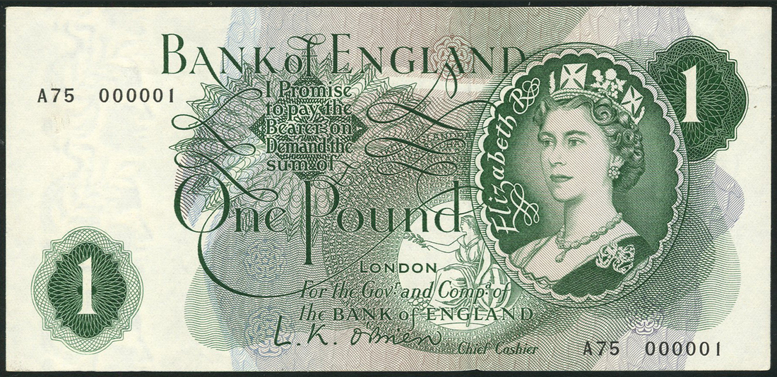 Bank of England, L.K. O'Brien, £1, ND (1960), serial number A75 000001, green and white, Elizabeth II at right, value low left, value top right, reverse green and white, Britannia top right