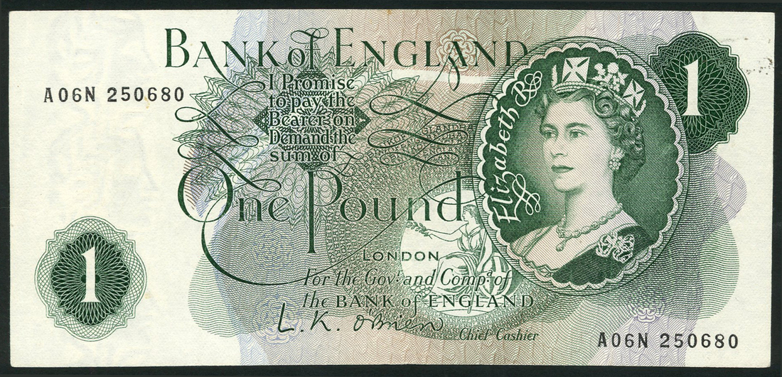Bank of England, L.K. O'Brien, £1, ND (1960), serial number A06N 250680, green and white, Elizabeth II at right, value low left, value top right, reverse green and white, Britannia top right