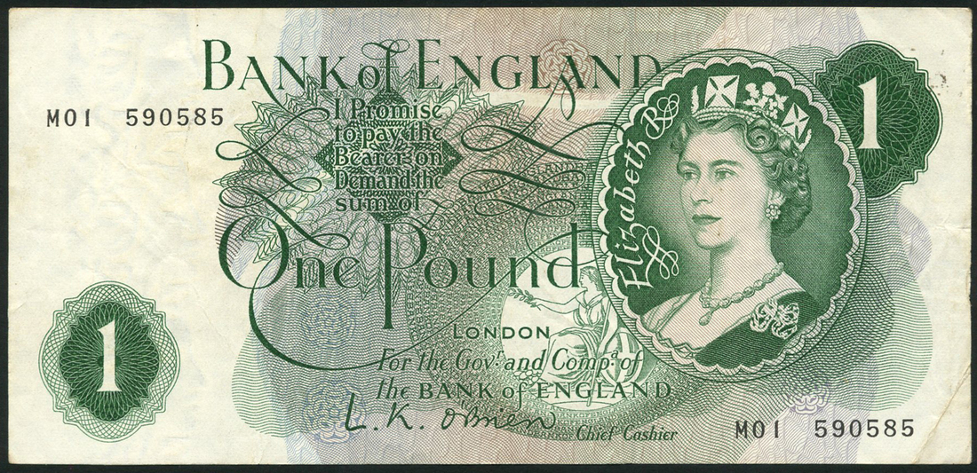 Bank of England, L.K. O'Brien, replacement £1, ND (1960), serial number M01 590585, green and white, Elizabeth II at right, value low left, value top right, reverse green and white, Britannia top right