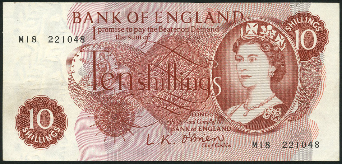 Bank of England, L.K. O'Brien, replacement 10/-. ND (1961), serial number M18 221048, brown and white, Elizabeth II at right
