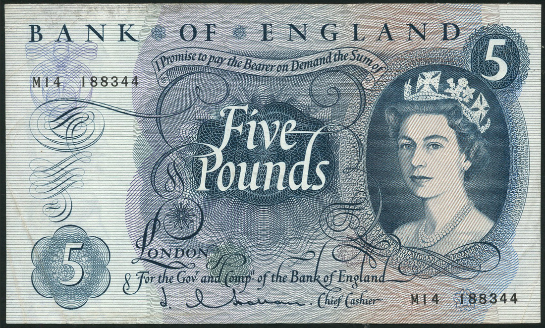 Bank of England, J Q Hollom, £5, ND (1963), serial numbers M01 064759 and M14 188344, blue, portrait Queen Elizabeth II at right, value at low left, centre and top right, reverse, seated Britannia at centre