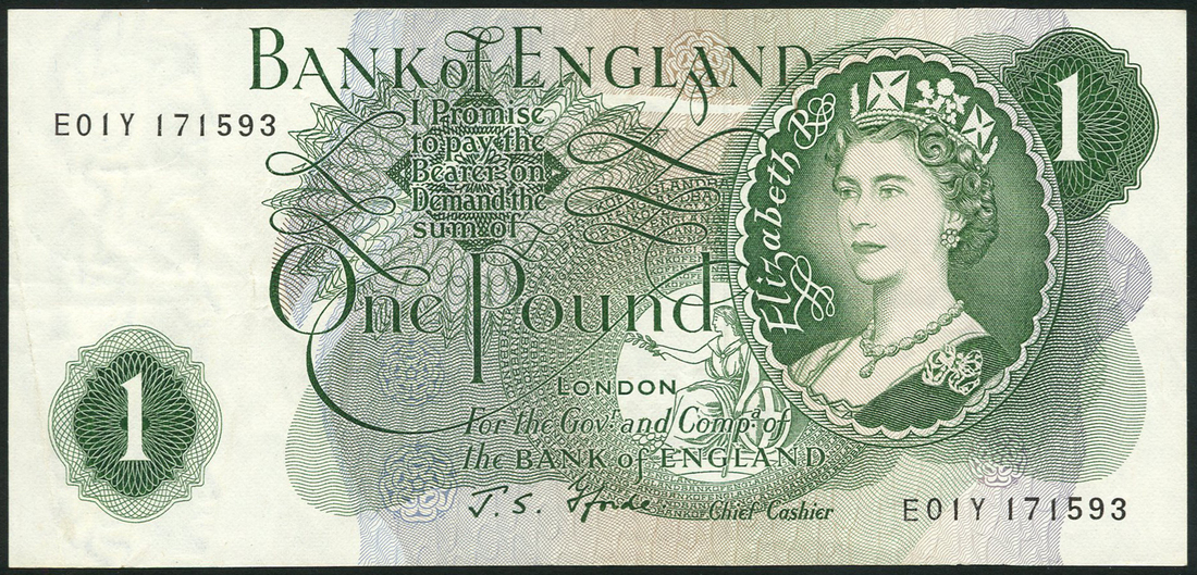 Bank of England, J S Fforde, £1, ND (1967), prefixes B98Y, E01Y, U01E, green, portrait Queen Elizabeth II at right, Britannia low centre right, value low left, centre and top right, reverse, Britannia centre right