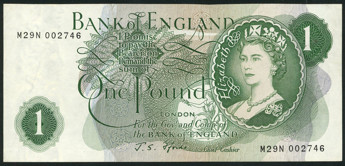 Bank of England, J S Fforde, replacement £1, ND (1967), serial number M29N 002746, green, portrait Queen Elizabeth II at right, value low left, centre and top right, reverse, seated Britannia centre right, guilloche patterns
