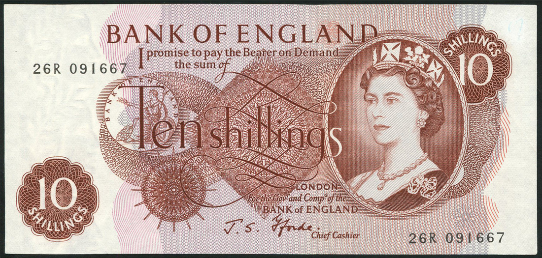 Bank of England, J S Fforde, 10 shillings, ND (1967), serial number 26R 091667 and D37N 643338, reddish brown, portrait Queen Elizabeth II at right, seated Britannia centre left, value in ornate circular frames low left and top right, reverse, Britannia at centre