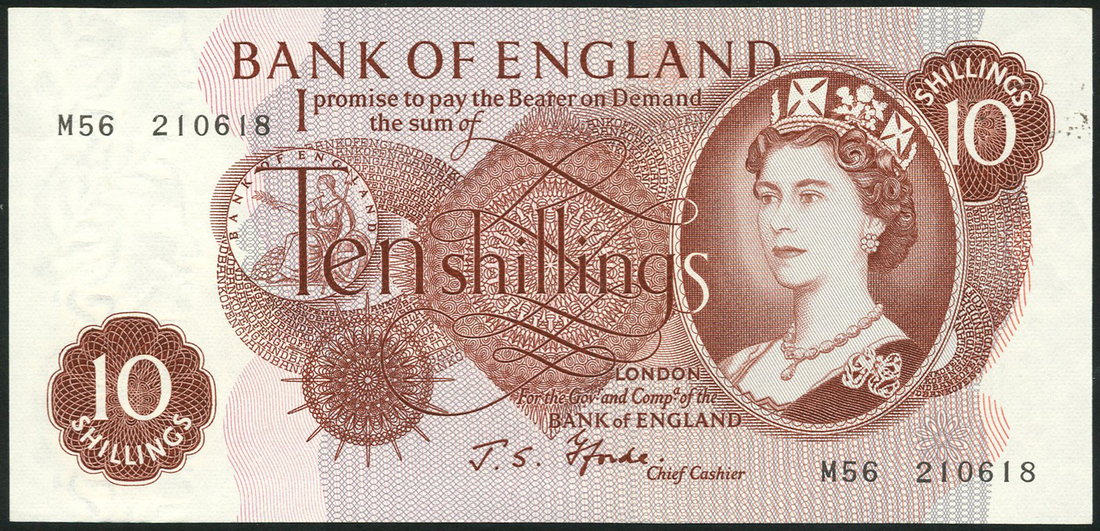 Bank of England, J S Fforde, replacement 10 shillings, ND (1967), serial number M56 210618 and M80 373672, reddish brown, portrait Queen Elizabeth II at right, seated Britannia centre left, value in ornate circular frames low left and top right, reverse, Britannia at centre