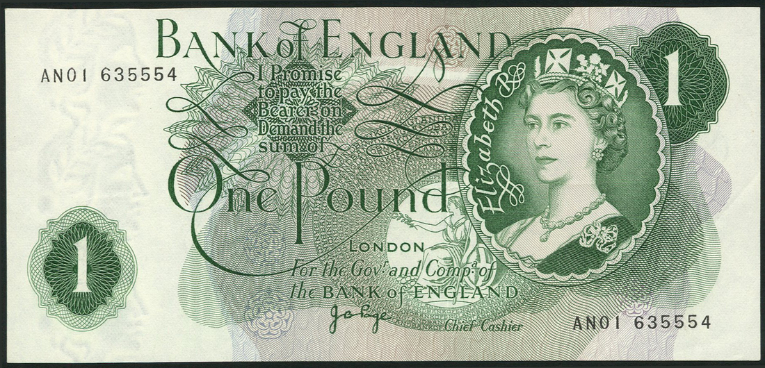 Bank of England, J B Page, £1, ND (1970), serial numbers AN01 63554 and HZ01 696561, green, portrait Queen Elizabeth II at right, value low left, centre and top right, reverse, seated Britannia centre right, guilloche patterns