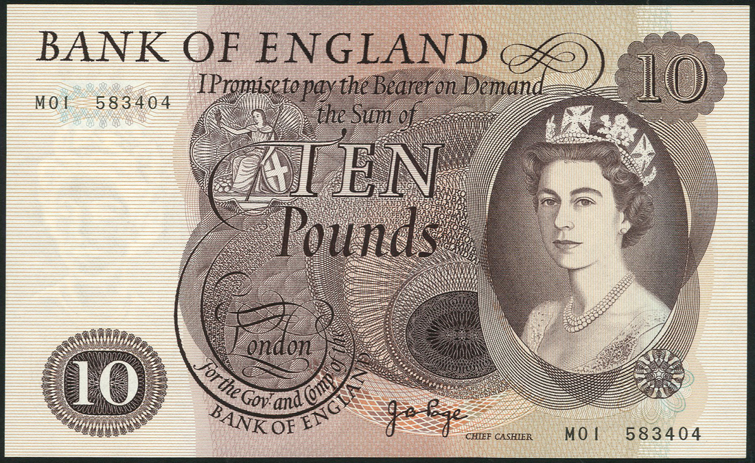 Bank of England, J B Page, £10, ND (1971), serial number M01 583404, brown and multicolour, portrait Queen Elizabeth II at right, Britannia centre left, value low left, centre and top right, reverse, lion with key