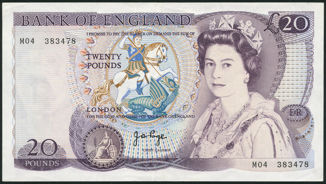Bank of England, J B Page, £20 (2), ND (1970), serial numbers M01 336227 and M04 383478, purple and multicoloured, Elizabeth II at right, Saint George and the Dragon at centre, Britannia at low left, reverse purple, Shakespeare at right