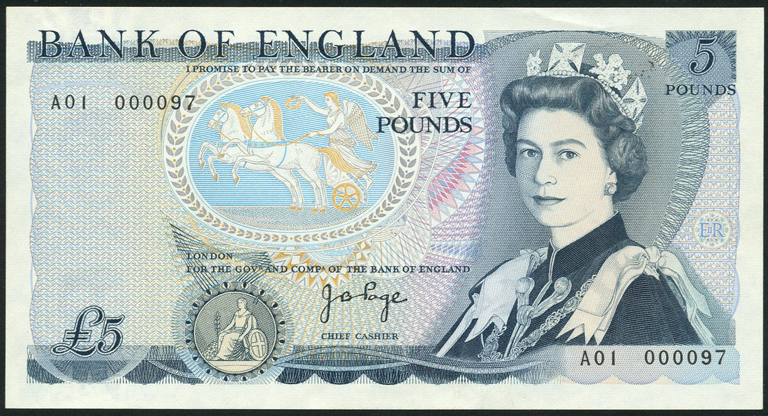 Bank of England, J B Page, £5, ND (1971), serial number A01 000097, blue, Elizabeth II at right, Britannia seal low left, Victory in biga left centre, reverse blue, Wellington and the battle of Waterloo