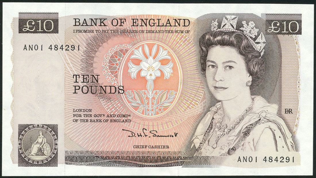 Bank of England, D H F Somerset, £10, ND (1984), serial number AN01 48429, brown and multicoloured, Elizabeth II at right, lily symbol at centre, reverse Florence Nightingale at right, Scutari hospital scene at centre left