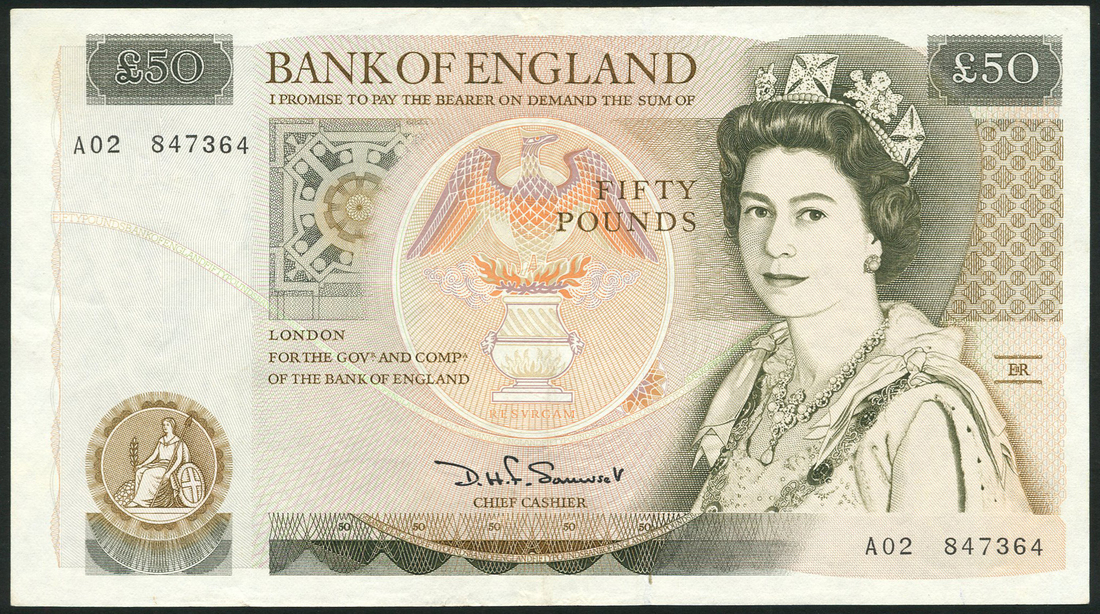 Bank of England, D H F Somerset, £50, ND (1981), serial number A02 847364, olive green on multicolour underprint, portrait Queen Elizabeth II at right, seated Britannia low left, phoenix rising from flames at centre, reverse, Sir Christopher Wren