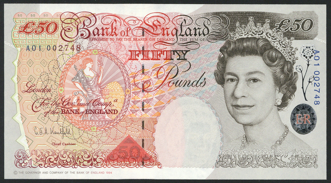 Bank of England, G. E. A. Kentfield, a group comprising £5, prefixes R01, AA01, green, £10, serial number A01 001507, orange, £20, serial number X01 002455, purple, £50, serial number A01 002748, red, all with Elizabeth II at right