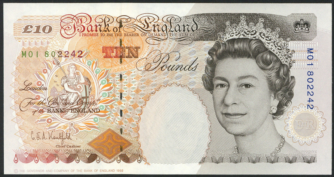 Bank of England, G E A Kentfield, £10, ND (29 April 1992), serial number M01 802242, brown, orange and multicolour, portrait Queen Elizabeth II at right, Britannia centre left, reverse, Charles Dickens