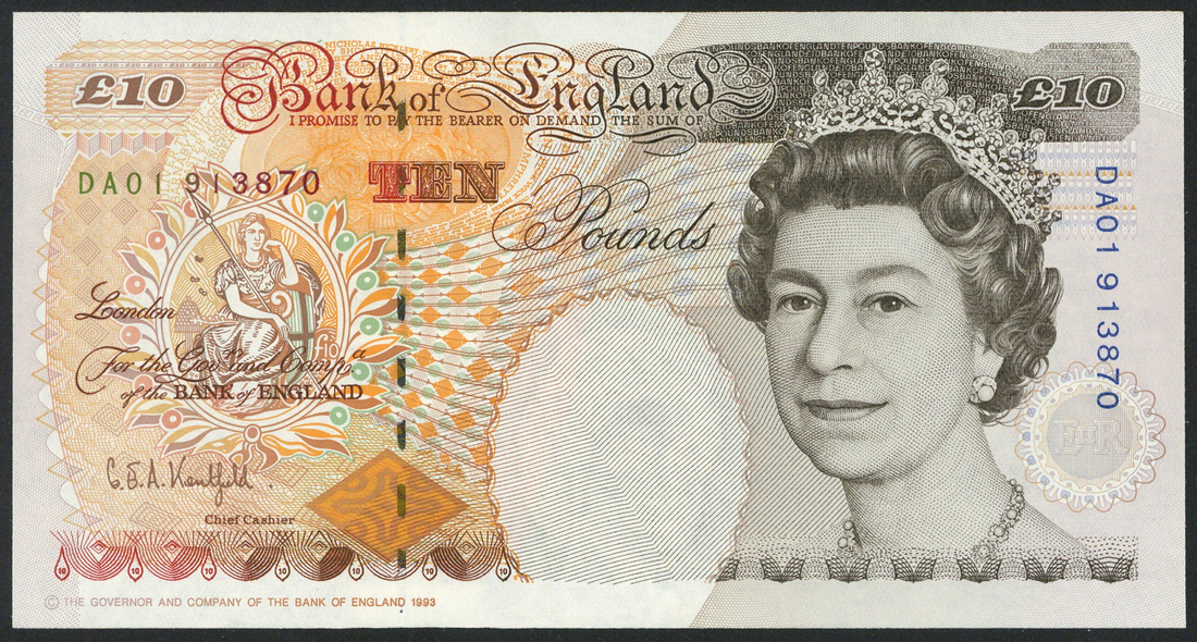 Bank of England, G. E. A. Kentfield, £10, later printing first run serial number DA01 913870, brown and multicoloured, Elizabeth II at right, value in both corners, reverse Dickens, cricket match
