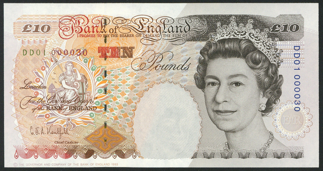 Bank of England, G. E. A. Kentfield, £10, later printing first run serial number DD01 000030, brown and multicoloured, Elizabeth II at right, value in both corners, reverse Dickens, cricket match