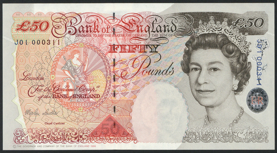 Bank of England, M. Lowther, a full set of first run from the 1999 issue, £5, prefix EA01, green, £20, KL01, orange, £20, prefix DA01, purple, £50, prefix J01, red, all with matching serial number 000311,