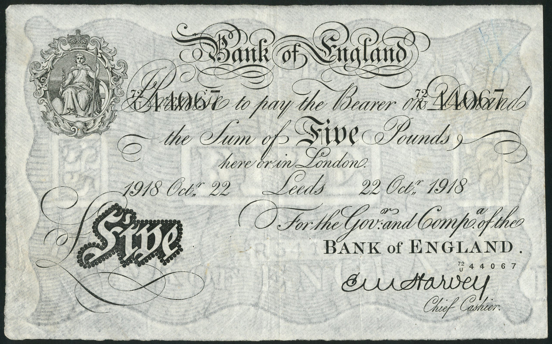 Bank of England, E.M.Harvey, £5, Leeds, 22 October 1918, serial number 72/U 44067, black and white, ornate crowned head of Britannia top left, value in black tablet low left