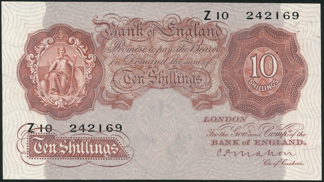 Bank of England, C.P.Mahon, 10 shillings, ND (1928), prefix Z10, brown, Britannia at left, value at right