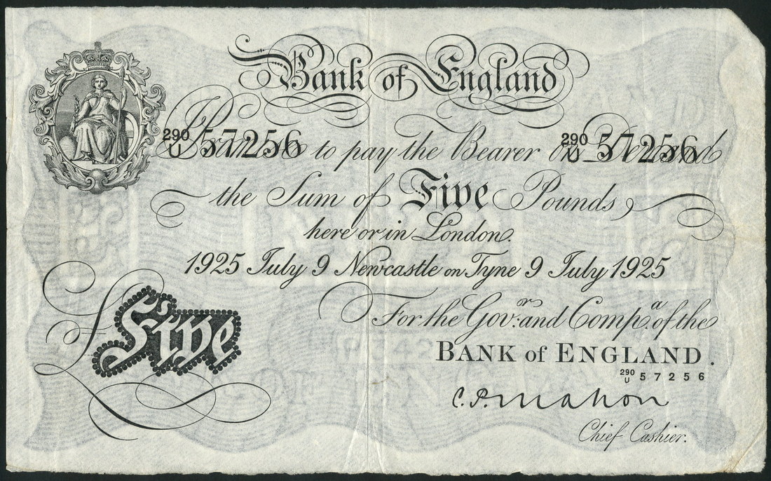Bank of England, C.P.Mahon, £5, Newcastle, 9 July 1925, serial number 290/U 57256, black and white, ornate crowned vignette of Britannia top left, value in black tablet low left