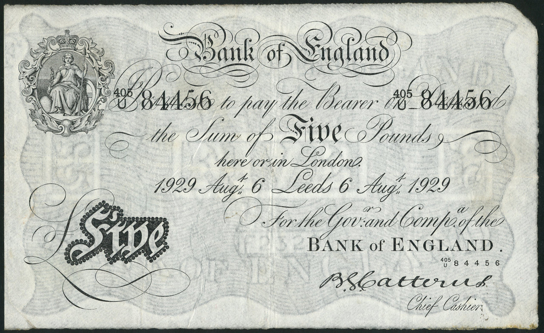 Bank of England, B.G.Catterns, £5, Leeds, 6 August 1929, serial number 405/U 84456, black and white, ornate crowned vignette of Britannia at top left, value in black tablet at low left