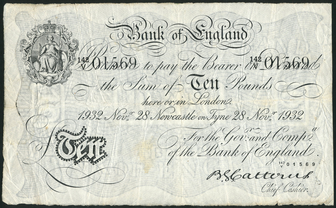 Bank of England, B. G. Catterns (1929-1934), £10, Newcastle, 28 November 1932, serial number 142/N 01569, black and white, ornate crowned vignette of Britannia top left, value in black tablet low left
