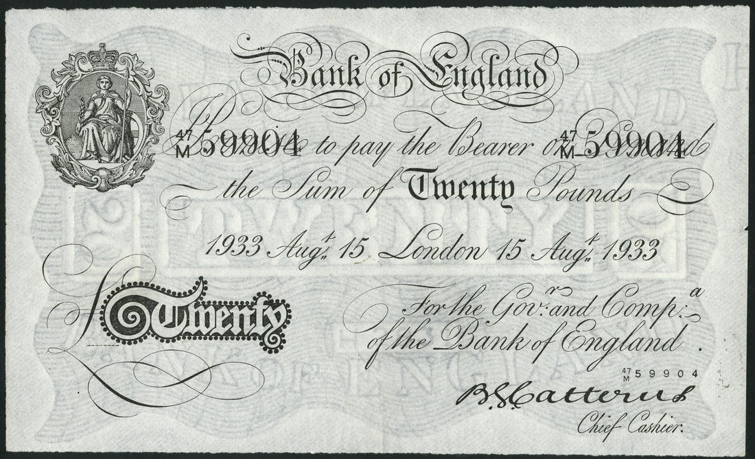 Bank of England, B.G.Catterns, an Operation Bernhard £20, London, 15 August 1933, serial number 47/M 59904, black and white, ornate crowned vignette of Britannia top left, value in black tablet low left