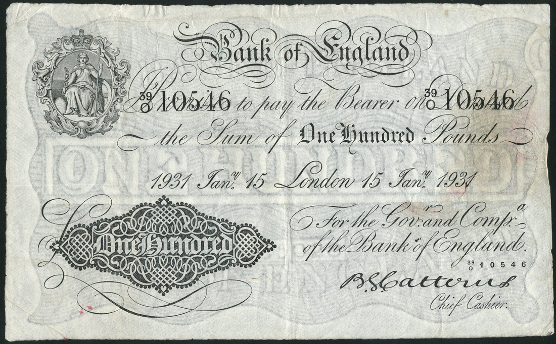 Bank of England, B.G.Catterns, £100, London, 15 January 1931, serial number 39/O 10546, black and white, ornate crowned head of Britannia top left, value in black tablet low left