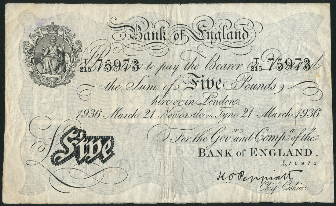Bank of England, K.O.Peppiatt, £5, Newcastle, 21 March 1936, serial number T/215 75973, black and white, ornate crowned vignette of Britannia top left, value in black tablet low left
