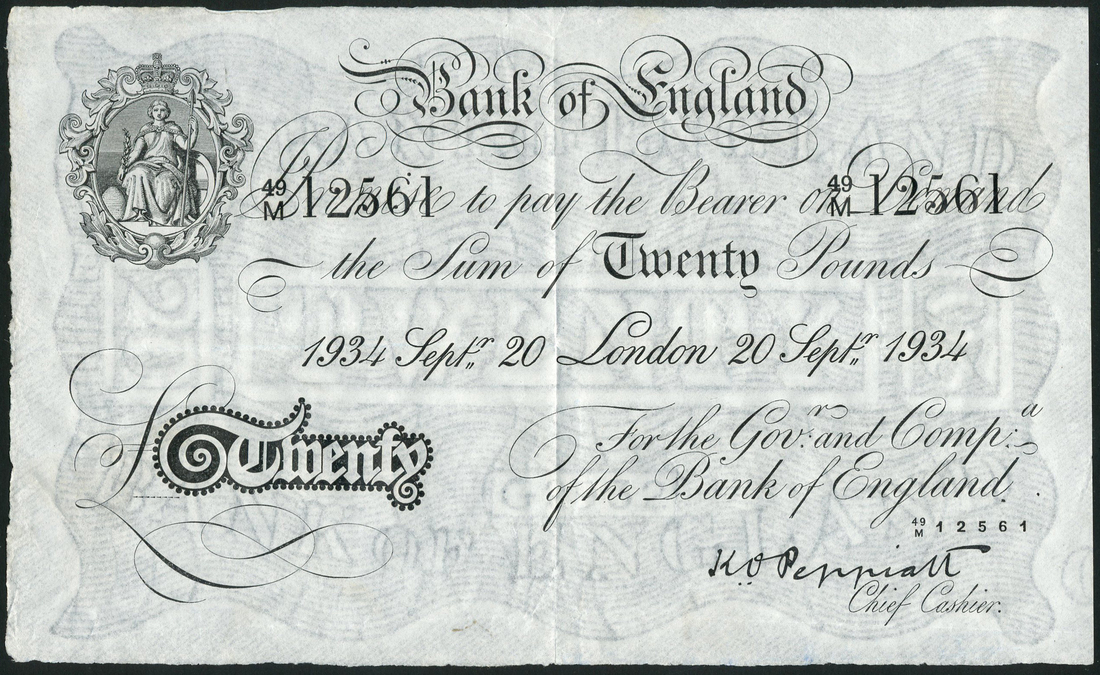 Bank of England, K.O.Peppiatt, £20 (2), 20 September 1934, serial numbers 49/M 12561-12562, black and white, ornate crowned vignette of Britannia at top left, value in black tablet at low left