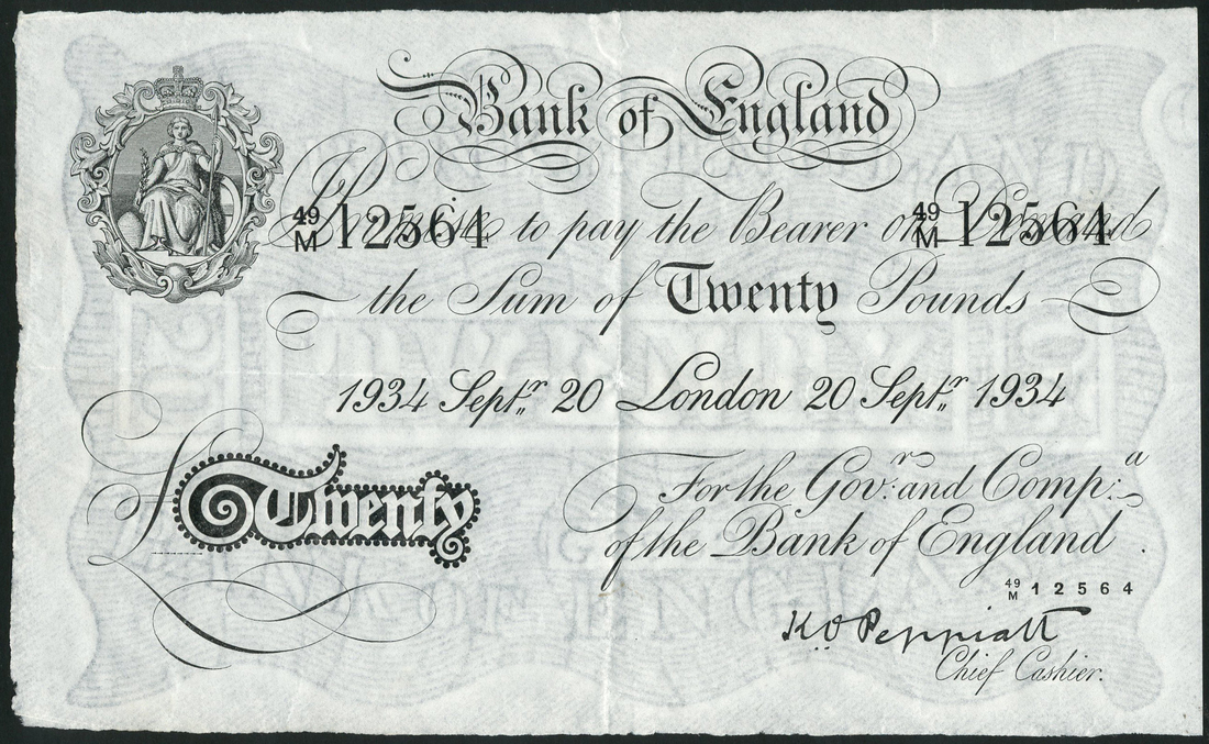 Bank of England, K.O.Peppiatt, £20, 20 September 1934, serial numbers 49/M 12564, black and white, ornate crowned vignette of Britannia at top left, value in black tablet at low left
