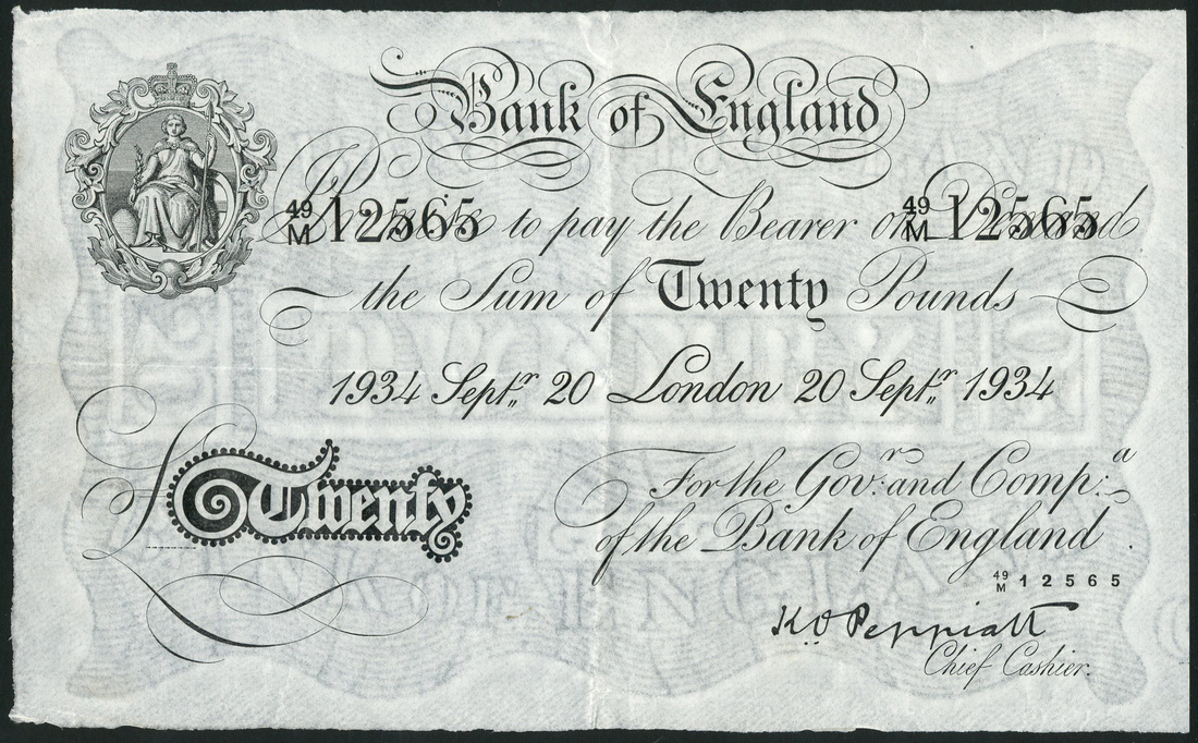 Bank of England, K.O.Peppiatt, £20, 20 September 1934, serial numbers 49/M 12565, black adn white, ornate crowned vignette of Britannia at top left, value in black tablet at low left