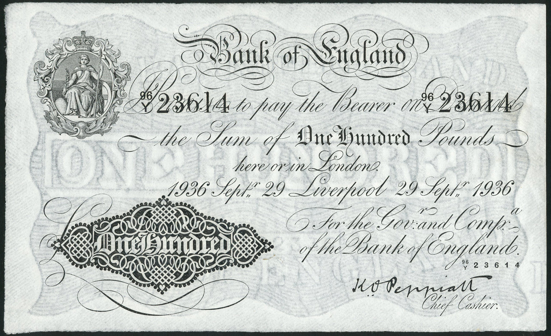 (x) Bank of England, K.O.Peppiatt, £100, Liverpool, 29 September 1936, serial number 96/Y 23614, black and white, ornate crowned vignette of Britannia top left, value in black tablet low left