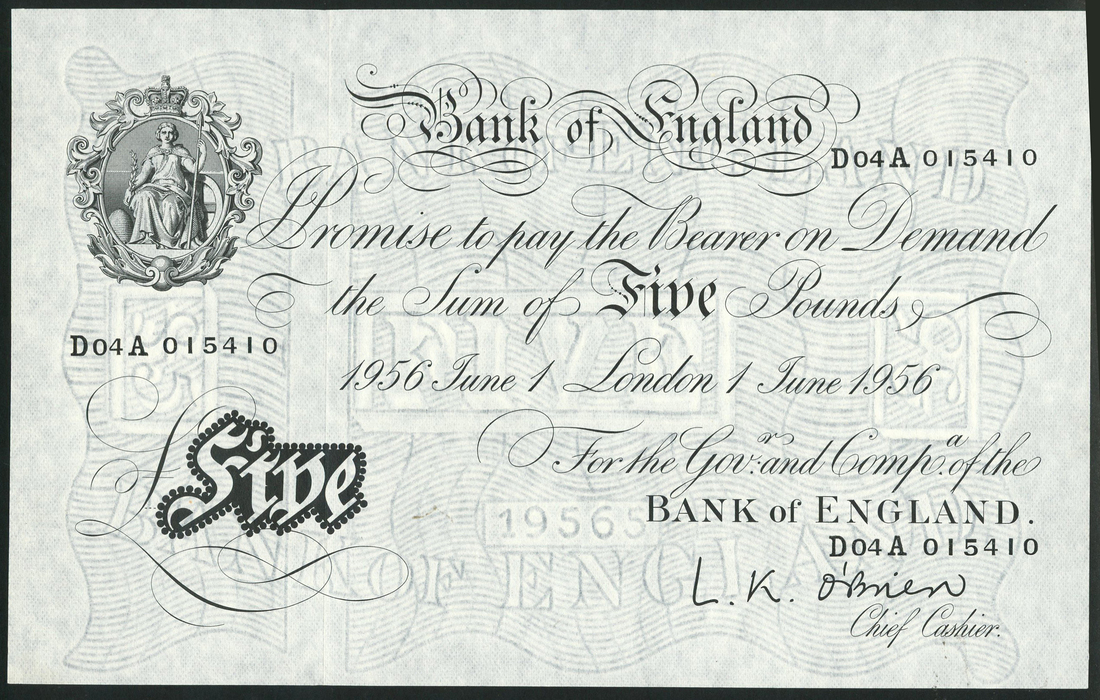 (x) Bank of England, L.K.O'Brien, £5, 1 June 1956, serial number D04A 015410, black and white, ornate crowned vignette of Britannia at top left, value in black tablet at low left