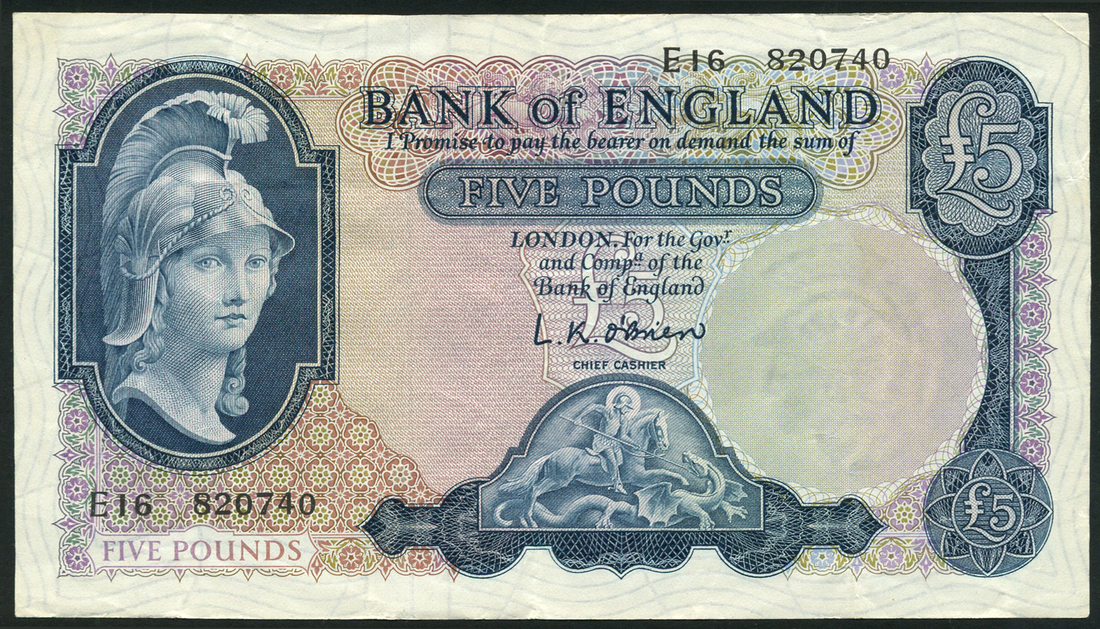 Bank of England, L.K.O'Brien, £1, ND (1955), prefixes Y68J, Y70J, O14K, A22K, T88K (5) , A97L (3), B36L, green, Britannia at left, £5, ND (1957), prefixes C69, D63, D90, D99, E02, E16, E18, blue on multicolour, Britannia at left, 10/-, ND (1961), prefixes J23, K06, B13, red-brown, Elizabeth II at right