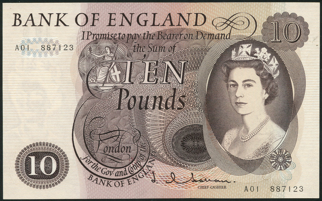 Bank of England, J.Q.Hollom, £10, prefix A01, brown, Gill, £10, prefix DR01, brown, £20, prefix A01, purple