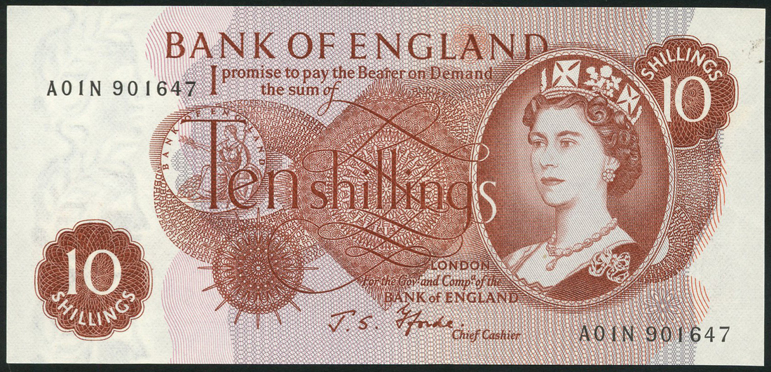 Bank of England, J.S.Fforde, 10 shillings, ND (1967), prefix A01N, brown, Elizabeth II at right