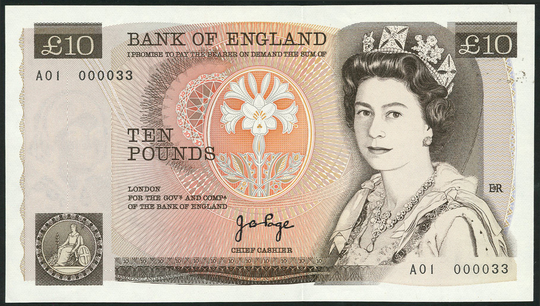 Bank of England, J.B.Page, £10, ND (1975), serial number A01 000033, brown, Elizabeth II at right, lily at centre