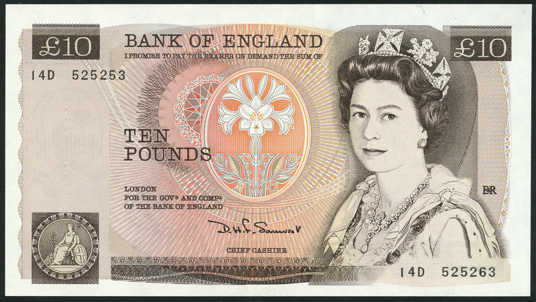 Bank of England, J.B.Page, ERROR: £5, ND (1971), serial number C86 291137/281137, blue, Elizabeth II at right and D.H.F.Somerset, £10, ND (1980), serial number 14D 525253/525623, brown