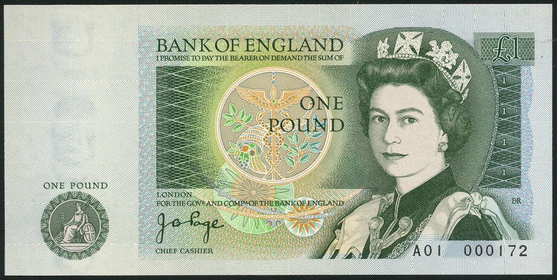 Bank of England, J.B.Page, £1 (2), ND (1978), serial number A01 000171/172, green, Elizabeth II at right, caduceus at centre