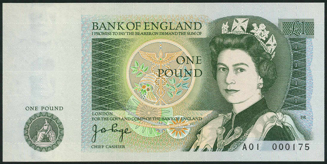 Bank of England, J.B.Page, £1 (2), ND (1978), serial number A01 000175/176, green, Elizabeth II at right, caduceus at centre