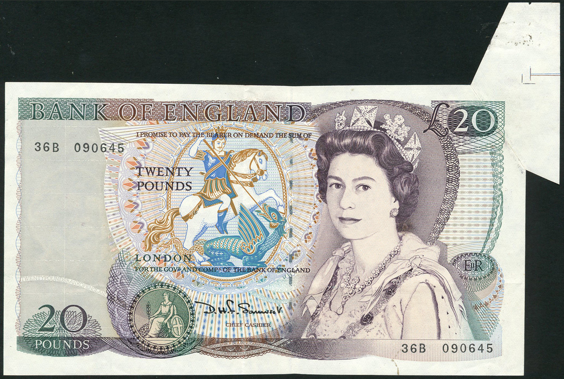 Bank of England, D.H.F.Somerset, £20, ND (1984), prefix 36B, purple, Elizabeth II at right, Saint George and the dragon at left centre, arms low left