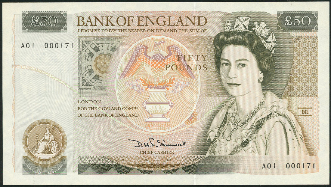 Bank of England, D.H.F.Someset, £50 (2), ND (1981), serial number A01 000171/172, green, Elizabeth II at right, phoenix at centre