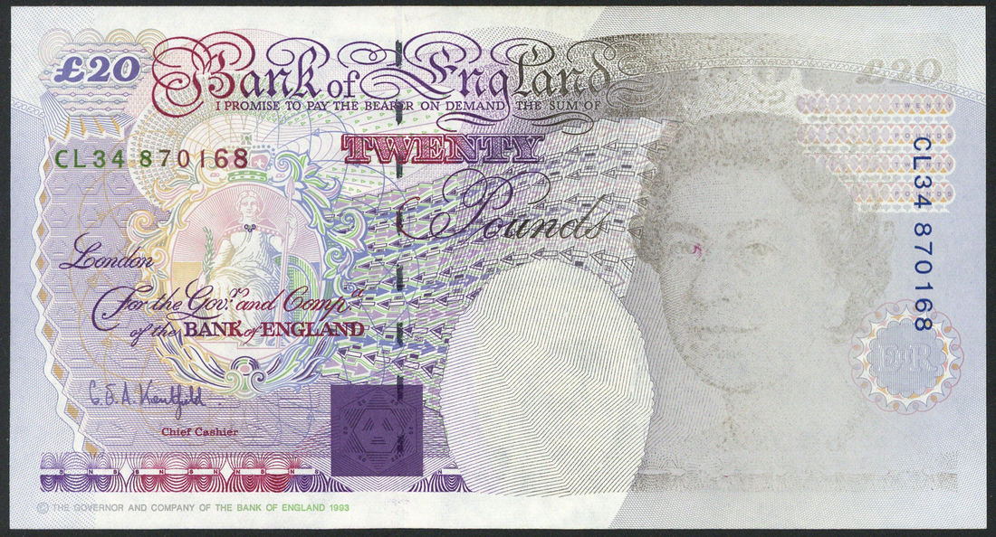 Bank of England, G.E.A.Kentfield, £10, prefix EK20, brown and £20, prefix CL34, purple