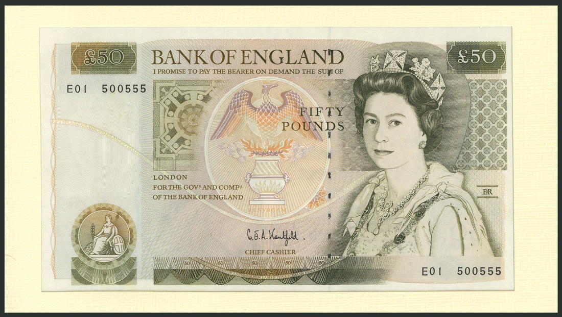 Bank of England, G.B.A. Kentfield, Debden Presentation Album, containing £5, £10, £20 and £50, all serial number 500555, red leatherette album, all notes first prefix with Elizabeth II at right
