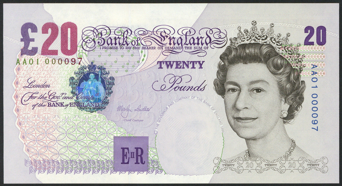 Bank of England, M. Lowther, £5, £10 and £20, ND (1999-2002), all first prefixes, serial numbers 000097, Elizabeth II at right, value at top corners, accompanied by an envelope stating that the notes came from the Bank of England Charity Auction in 2003