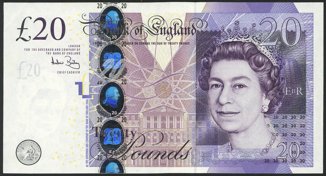 Bank of England, Andrew Bailey, £5, prefix LL56, blue and £10, prefix LL05, brown, both ND (2004), also £20, ND (2004), prefix LL26, purple, all Elizabeth II at right